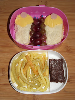 Another Sweet Set LunchPunch sandwich. This time I used the ice cream cone cutters with cheese "ice cream" and turkey for the "cherry". I'm still getting the hang of cutting sandwiches. I find that if the sandwich is too think, the part where the cutter is supposed to leave indentations (like the cone part) end up cutting up the bread (like the left sandwich). The cupcake cutter from that set is still my (and C's) favorite.